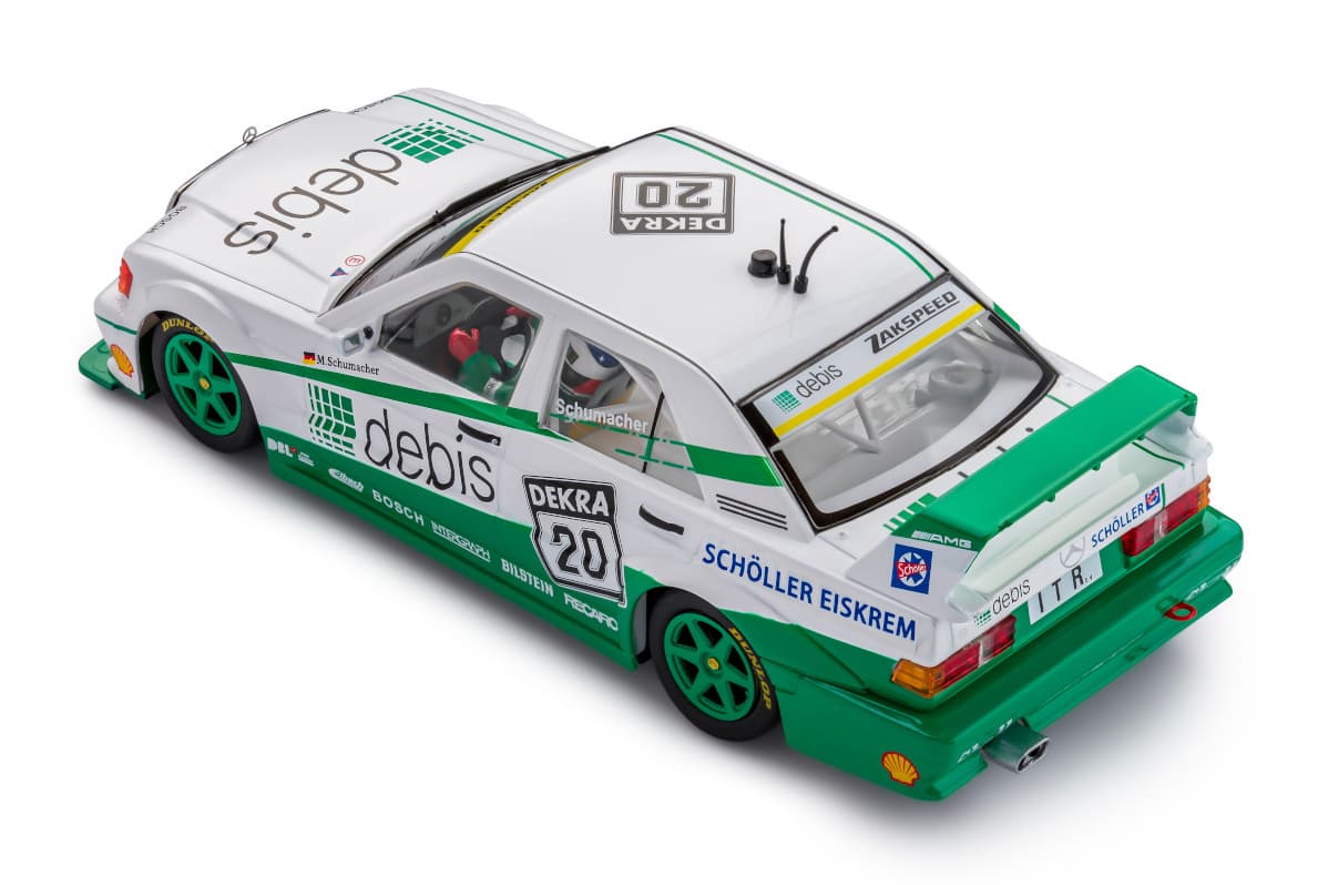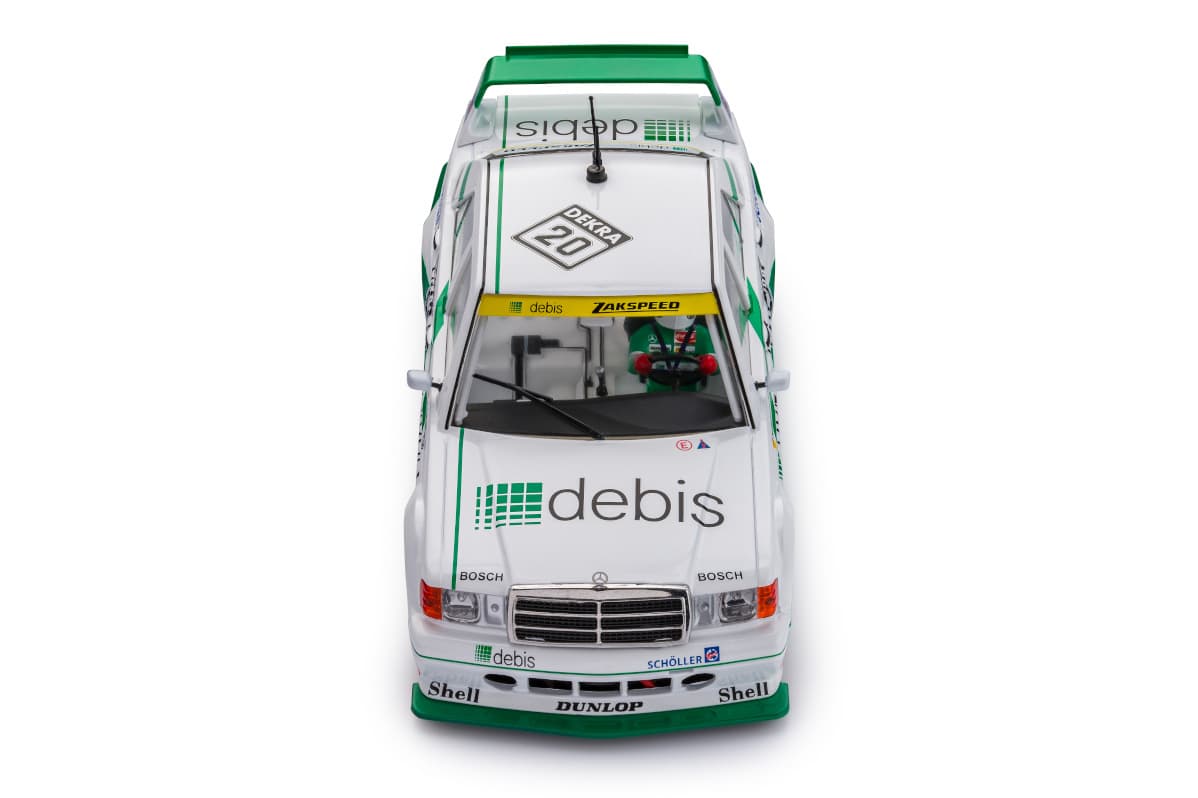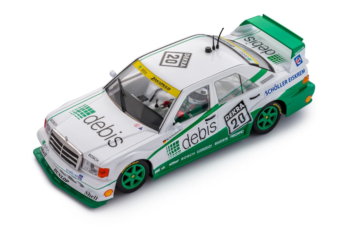 Michael Schumacherがドライブするメルセデス190E 2.5-16 エボⅡは、1991年のドイツツーリングカー選手権(DTM)第6戦ノリスリンクに参戦した。debisがスポンサーを務めるチーム ザクスピードがエントリーしたこのマシンは約235馬力を発生する2.5リッター直4気筒エンジンを搭載したクラス1のツーリングカーでリアウイングが目立つ空力キットが特徴だった。メルセデスベンツのジュニア・プログラムに参加していたF1以前のシューマッハは、難易度の高いコーナーとハイスピードで知られる2.3Kmのタイトなノリスリンク・サーキットでその才能を発揮した。